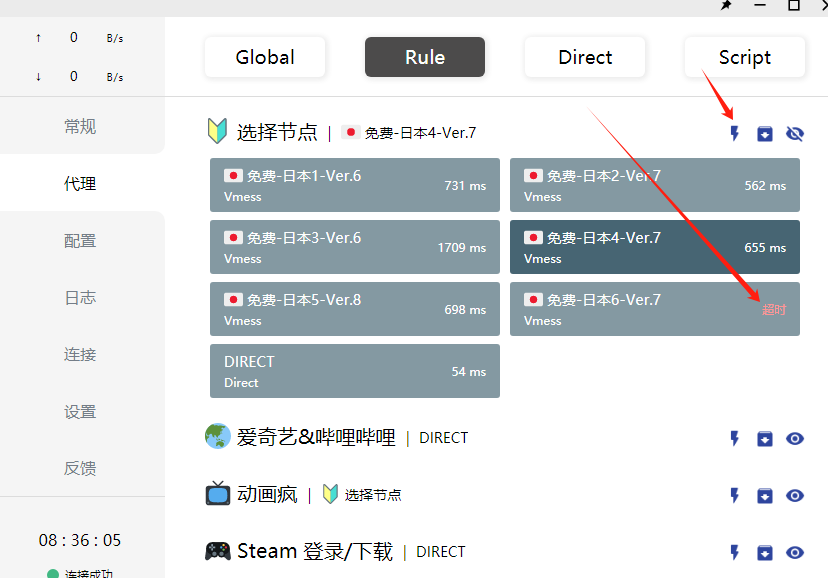 - 如果无法使用,更换节点(点击“⚡”符号延迟测试,超时状态无法使用)
